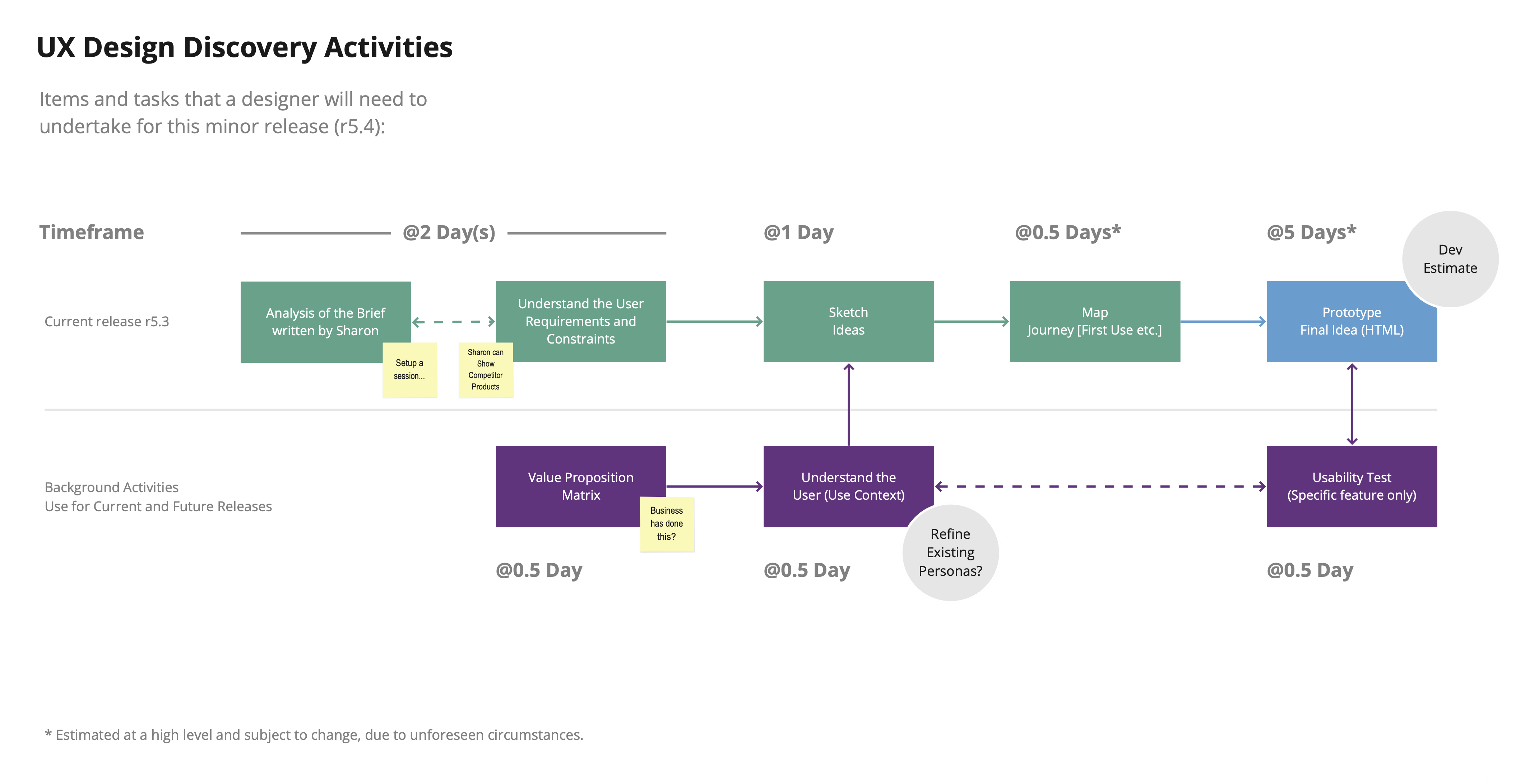 A six-day discovery plan covering stakeholder workshops, value mapping, user journey mapping, and prototype validation.