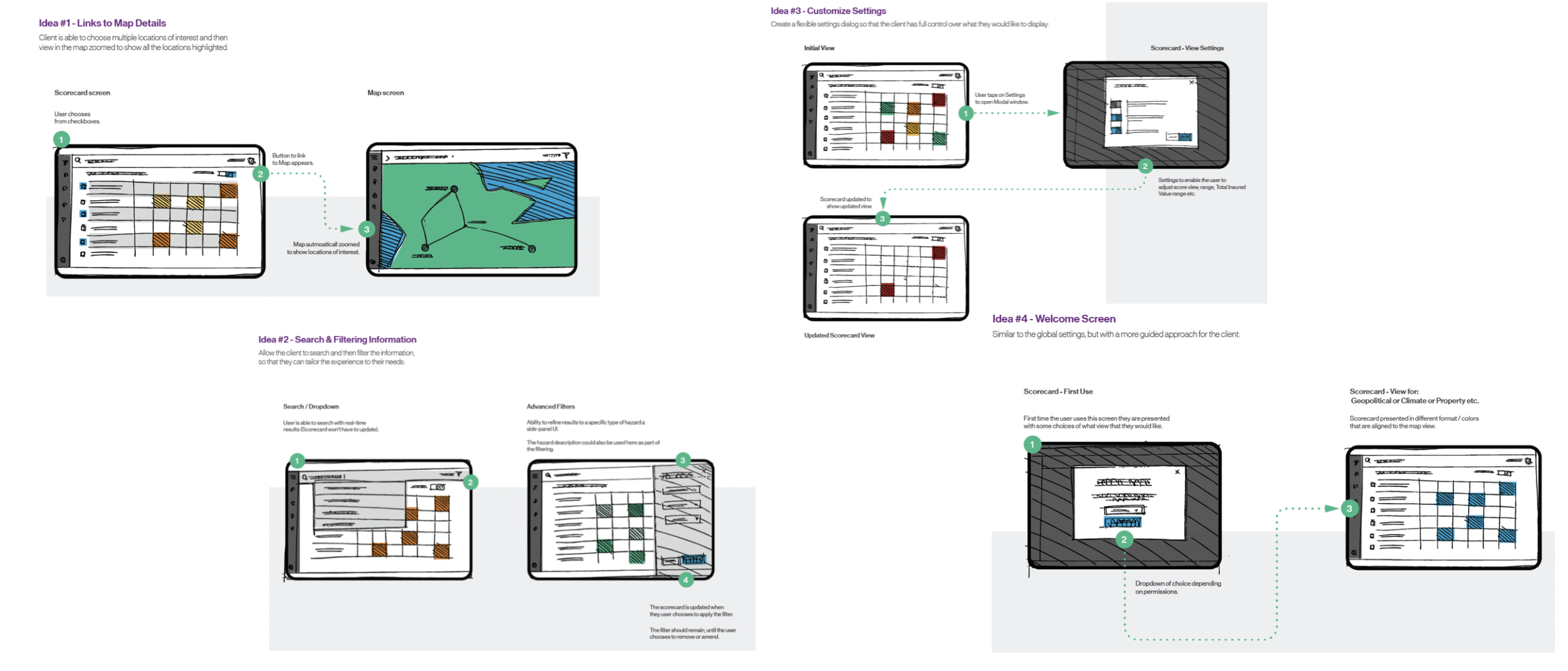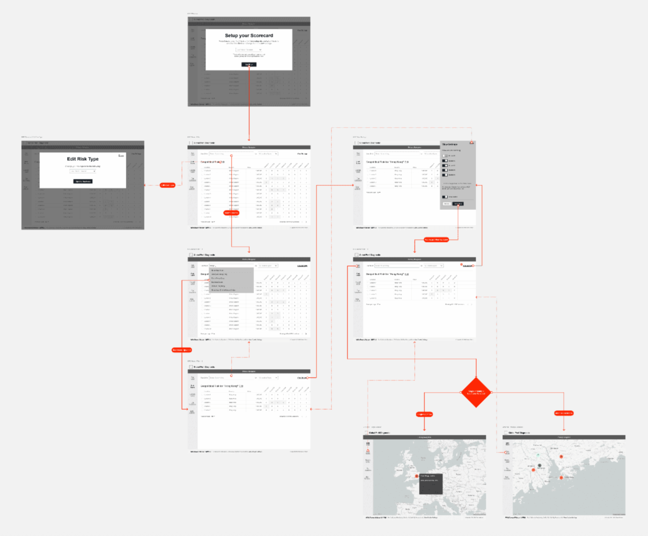 Consolidated mid-fidelity wireframes aligned across map, data, and scorecard modules.