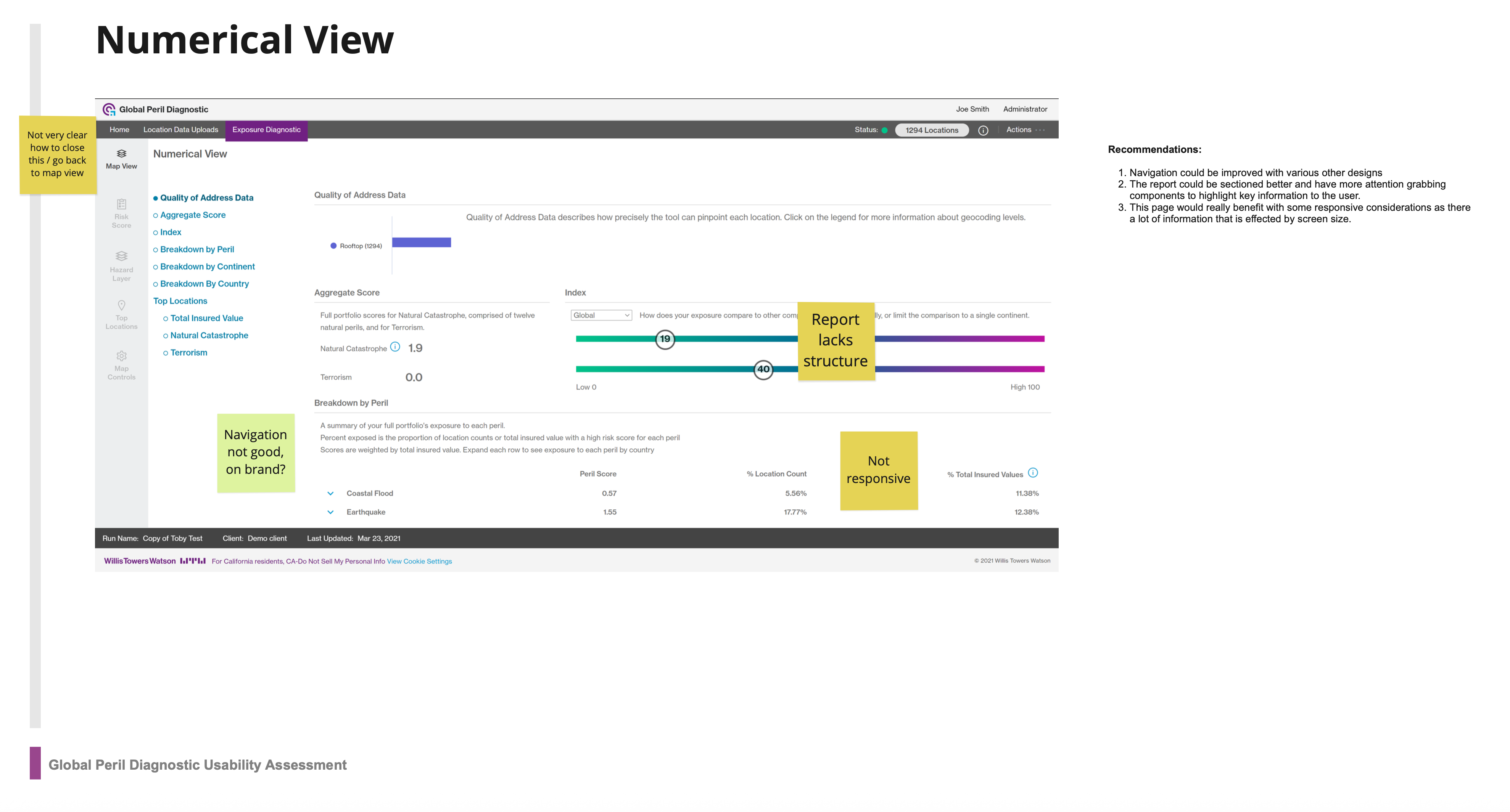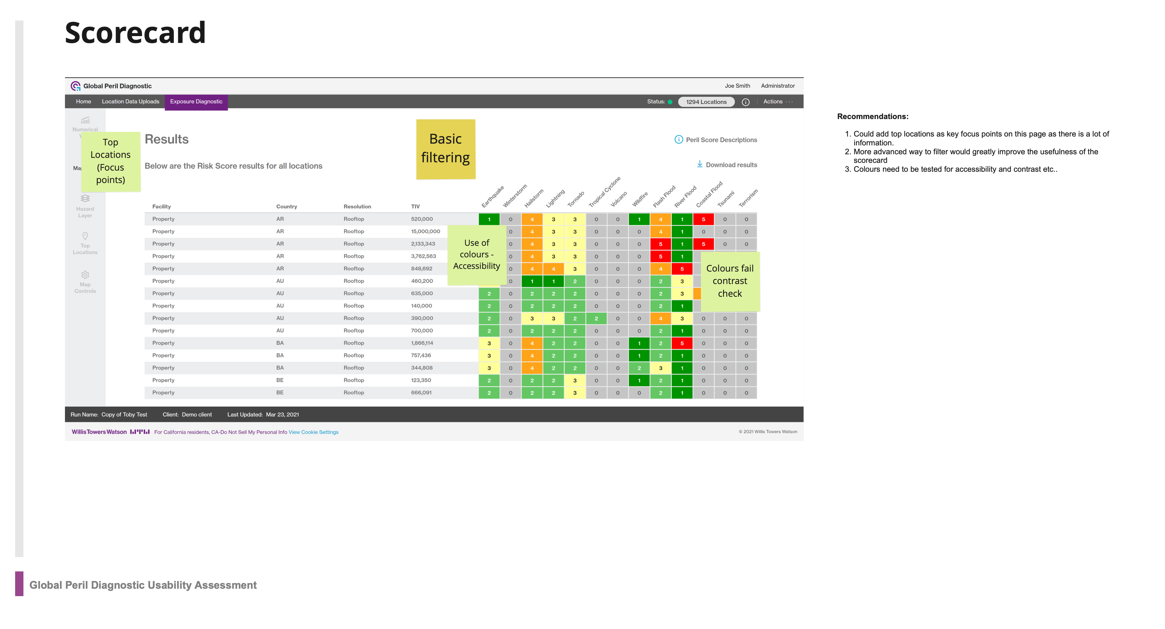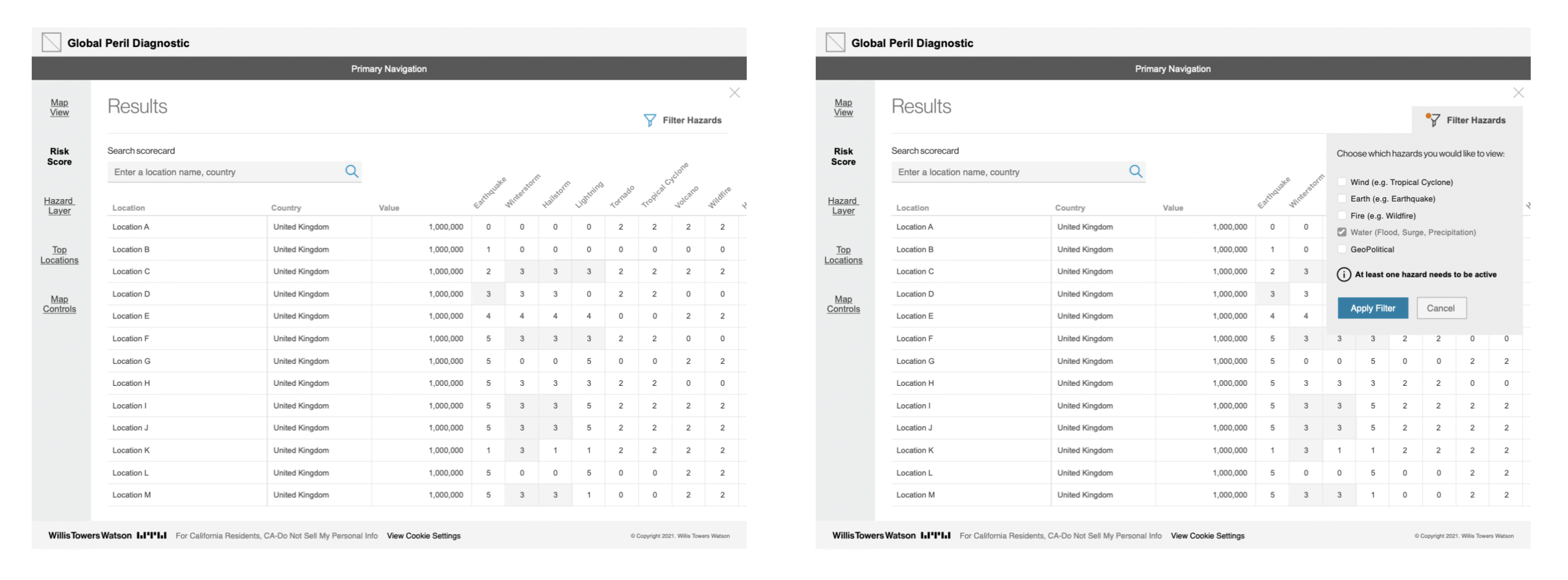 The new scorecard presents complex peril data in a clean, visual format that’s easy to scan and interpret. Map layers were redesigned with accessible colour palettes and consistent interaction patterns, while the numerical view now follows a clear hierarchy and adapts fluidly across screen sizes. The map and data views work together responsively, allowing users to explore patterns without losing context.